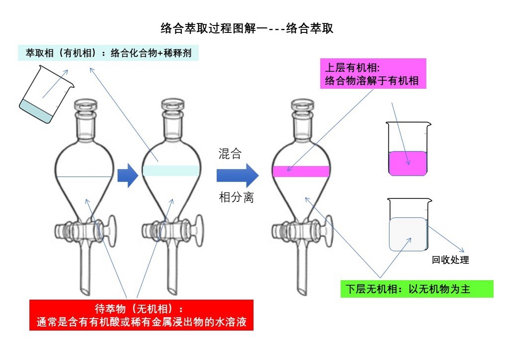 絡合萃取分離的基本原理是:溶液中的待萃物質與含有絡合劑的萃取有機溶劑相接觸, 絡合劑與待萃溶質通過官能團之間的反應形成絡合物, 使其轉移到萃取相中達到分離,然后根據逆向反應使萃取溶劑再生以循環使用,而溶質得以回收。